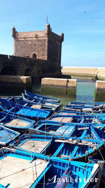 Nous poursuivons notre promenade et nous dirigeons tranquillement vers le port de pêche d’Essaouira et la célèbre Skala. Le port connait une activité soutenue et on assiste au retour des bateaux de pêche ou au départ des bateaux pour l’île de Mogador, l’ancien nom de la ville donné par les Français, au début du protectorat.